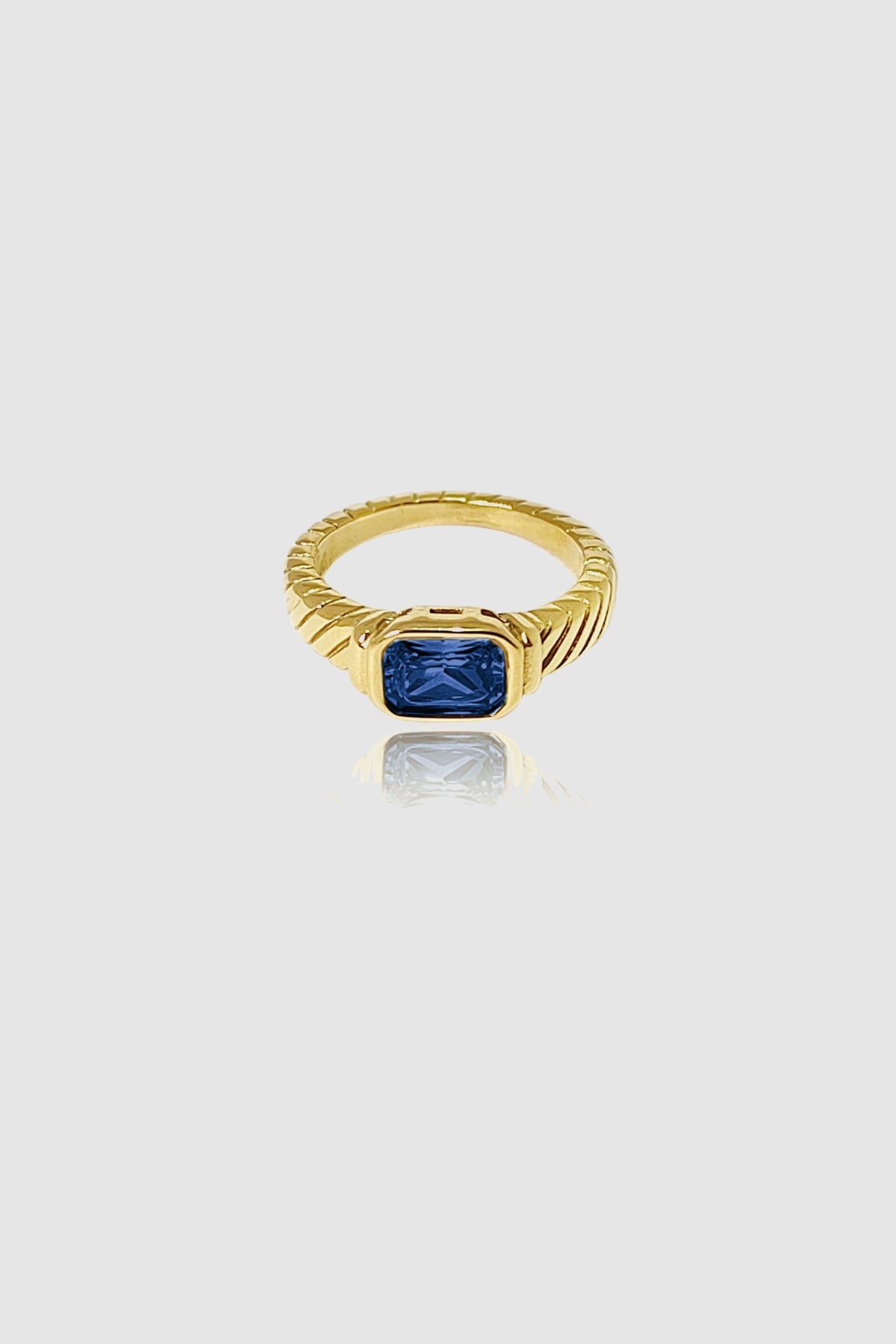 Bold, captivating, and effortlessly refined—the Royal Blue Elegance Ring is a true statement of luxury. Featuring a vibrant emerald-cut green gemstone, this stunning piece is set in a textured gold band that enhances its sophisticated charm. The deep green hue symbolizes growth and prosperity, making this ring the perfect choice for marking special moments or adding a touch of timeless elegance to any look.